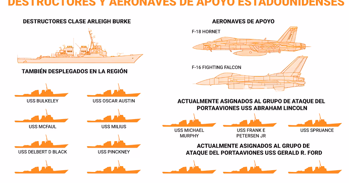 A los destructores se sumaría el apoyo aéreo de cazas F-15, F-16 y F-18, equipados con misiles para enfrentar eventuales ataques coordinados de drones iraníes.